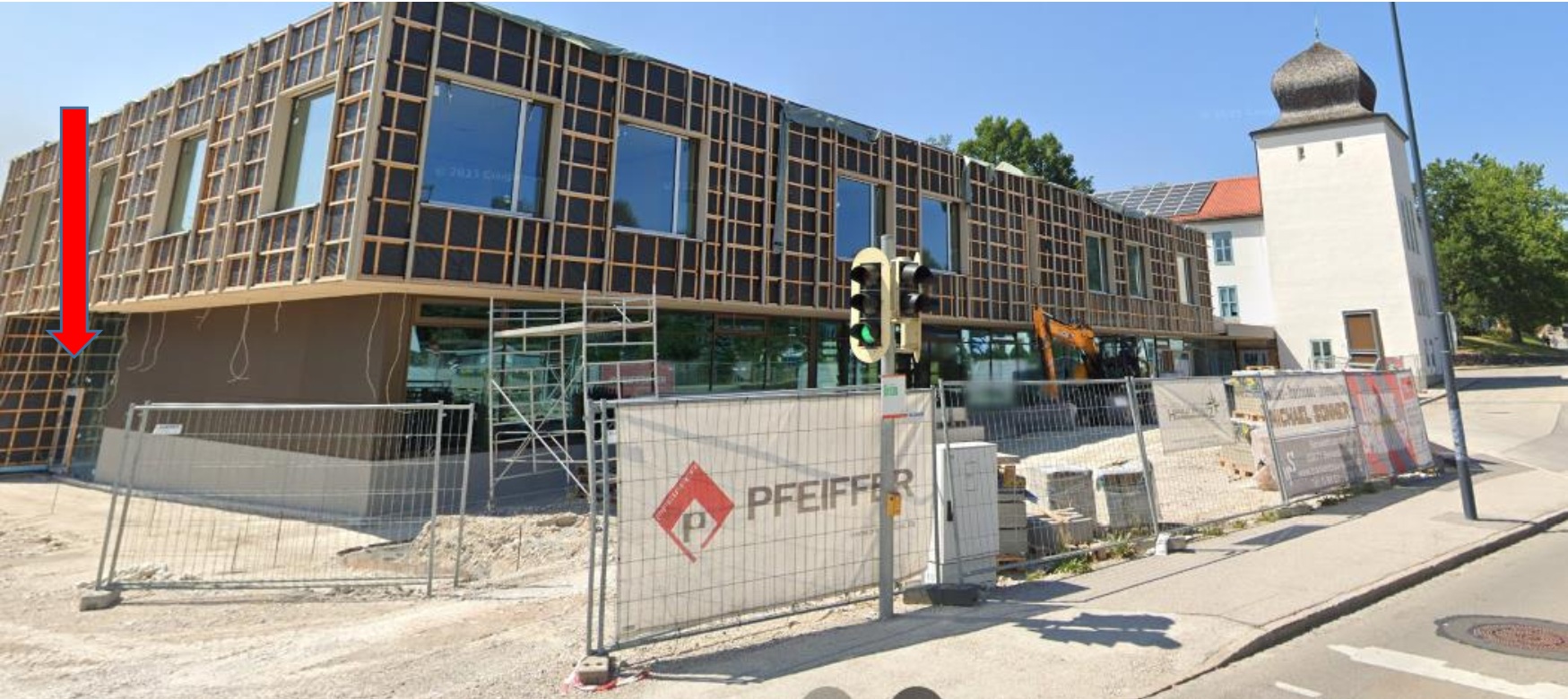Der Zugang ist links vom Gebäude / Neubau.